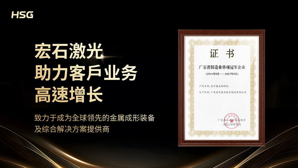 宏石激光自2006始創(chuàng)至今,已榮獲國(guó)家高新技術(shù)企業(yè)、國(guó)家知識(shí)產(chǎn)權(quán)優(yōu)勢(shì)企業(yè)獎(jiǎng)、行業(yè)創(chuàng)新大獎(jiǎng)等多項(xiàng)國(guó)家和行業(yè)榮譽(yù)。此次獲評(píng)“廣東省制造業(yè)單項(xiàng)冠軍企業(yè)”,是對(duì)宏石激光堅(jiān)實(shí)技術(shù)實(shí)力、良好產(chǎn)品品質(zhì)與強(qiáng)勁市場(chǎng)競(jìng)爭(zhēng)力的高度認(rèn)可。宏石激光堅(jiān)持以助力客戶業(yè)務(wù)高速增長(zhǎng)為品牌使命,一直不遺余力地通過優(yōu)質(zhì)產(chǎn)品、先進(jìn)服務(wù)等推動(dòng)中國(guó)制造實(shí)現(xiàn)智能化轉(zhuǎn)型,致力于成為全球領(lǐng)先的金屬成形裝備及綜合解決方案提供商。