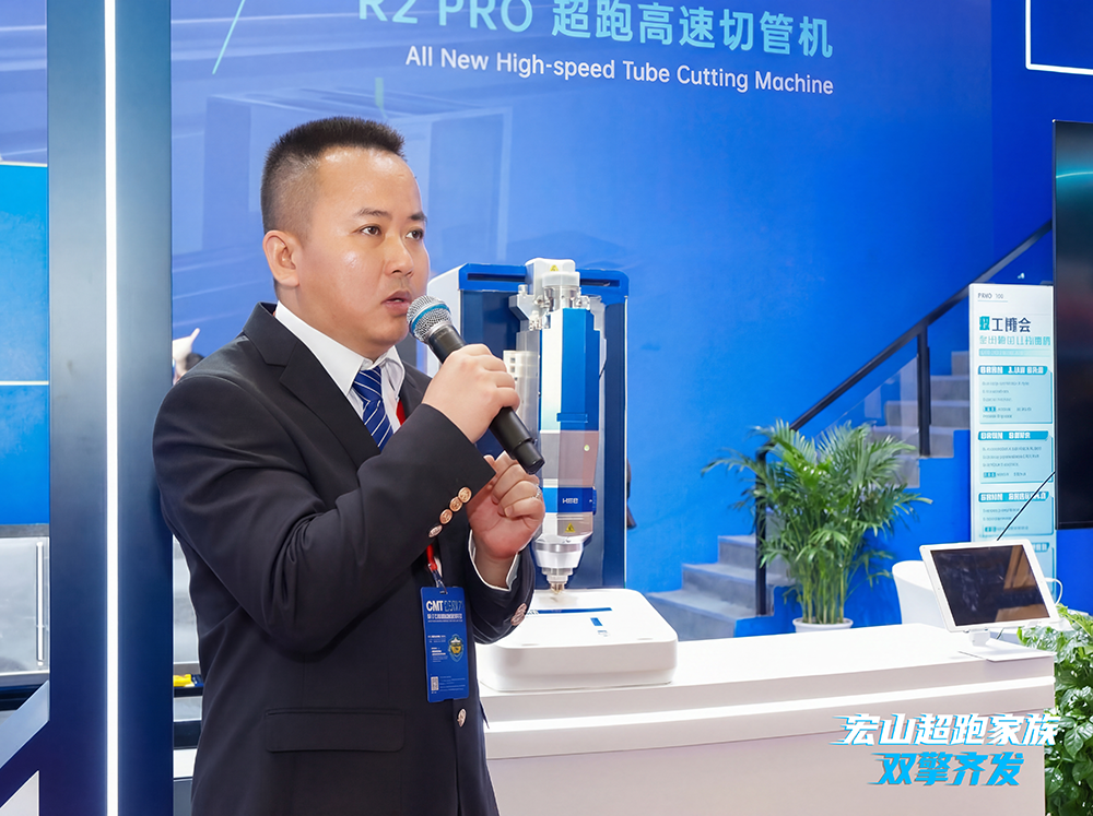 隨后,宏山激光智能管切事業部產品經理李康池對R2 PRO超跑高速切管機進行了詳細剖析。他表示:“當前中型管材加工在效率與精度方面仍存在限制,整體成本較高,高速度與高精度已成為激光切管機的核心需求。”宏山R2 PRO高速切管機順勢而出,以高速度、高精度、高穩定性重新定義激光切割設備性能標桿,為客戶提供更高效、更穩定的解決方案。