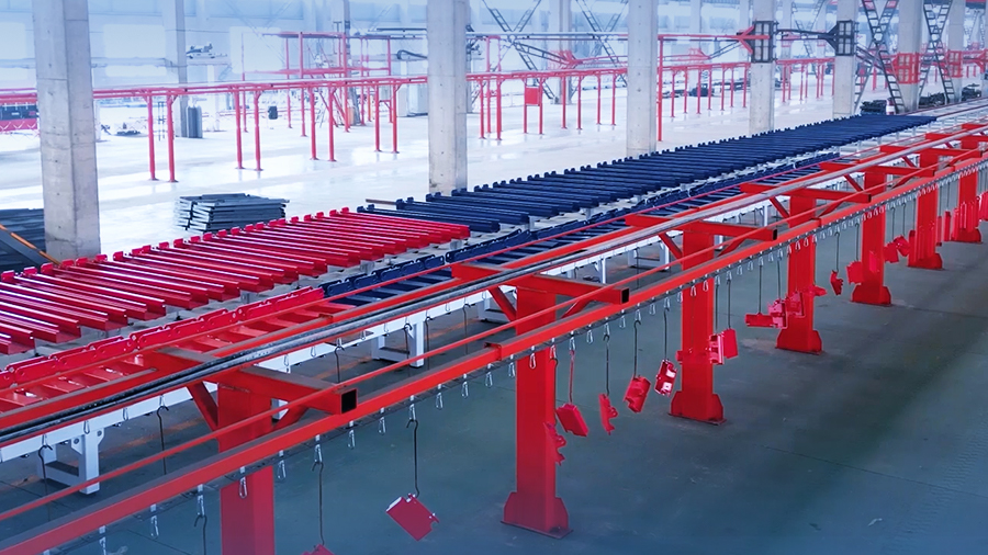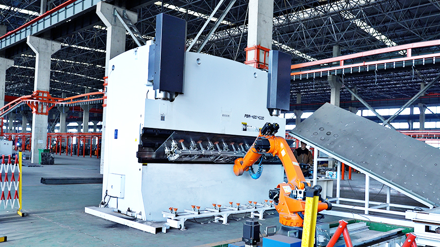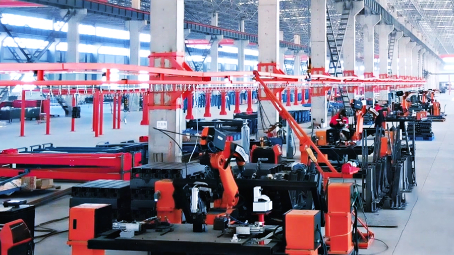 產線上配套國內先進的激光切割機,數控折彎機、庫卡機械手臂,川崎焊接機器人及相應配套的四軸、三軸變位機,自動噴涂機器人等智能自動化設備。”董總帶領宏山銳視角團隊穿行在產線間,各類機器設備有條不紊地流轉、托起、加工、下料;大型零部件在車間內歷經多道加工,從平面到造型,從裸色到上色。整個車間在極致的有序中,譜寫著年產能30000臺的實績。